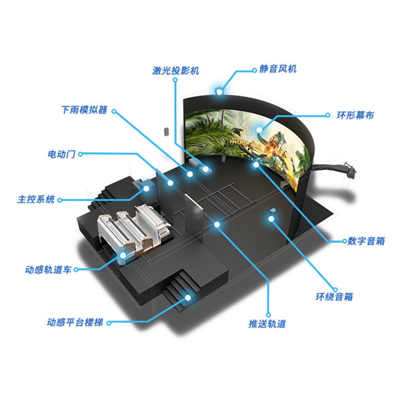 軌道影院內(nèi)置半球形傾斜巨幕,在影院體驗(yàn)時(shí)看到,電影的畫面布滿了整個(gè)半球體,再配合動(dòng)感座椅和多聲道的立體聲效果,使得觀眾猶如置身于影片之中,身臨其境地伴隨著情節(jié)的發(fā)展而體驗(yàn)到跌宕起伏的觀影樂(lè)趣。